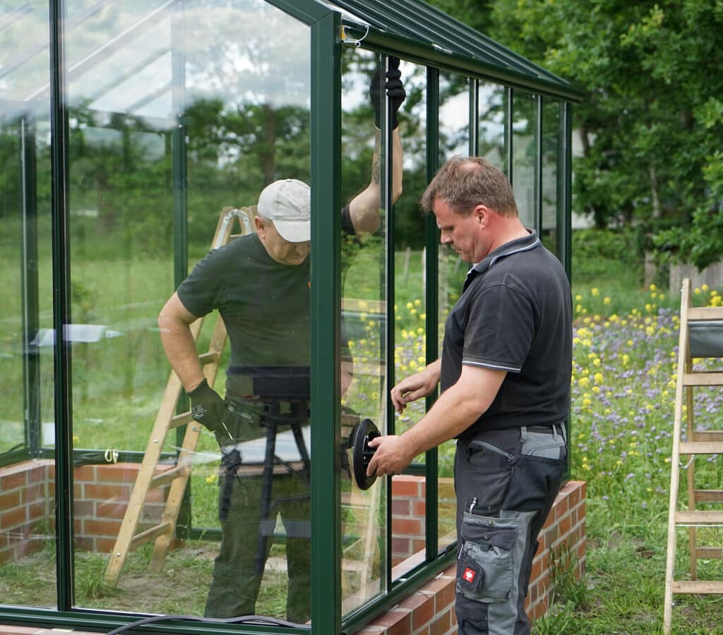 Fertig – das neue Highlight des Gartens steht. Jetzt kann das neue Glasgewächshaus bepflanzt werden.