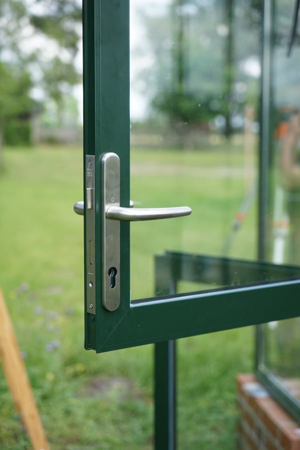 Montage der Tür – diese kommt in zwei Teilen daher und ist größtenteils vormontiert. Ist die Tür drin, wird das Schloss eingesetzt und verschraubt. Türfeststeller und Magnetfeststeller folgen. Fallrohre für das Regenwasser werden mit den beigelegten Halterungen am Gewächshaus verschraubt. Eine Verkleidung des oberen Gewächshaus-Sockels verhindert später stehendes Wasser auf dem Mauerwerk des Gewächshauses.